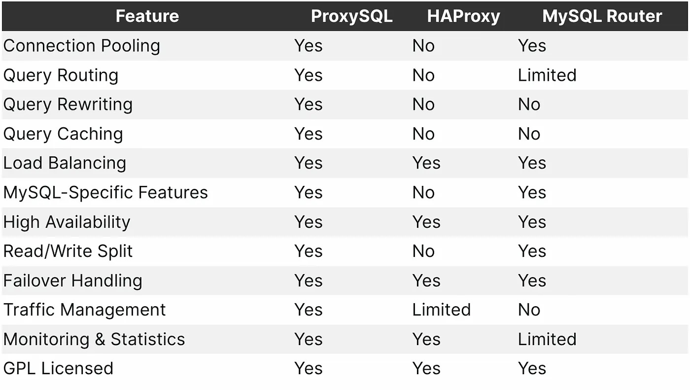 HAProxy: Known for its high performance and reliability, HAProxy has been a popular choice for years. However, it lacks some of the MySQL-specific features that ProxySQL offers, such as query routing and rewriting, and connection pooling.