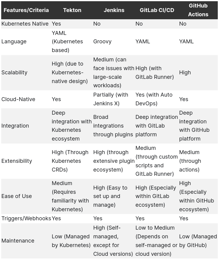 Comparing Tekton with other CI/CD solutions like Jenkins, GitLab Runner, and GitHub Actions, illuminates its unique strengths.